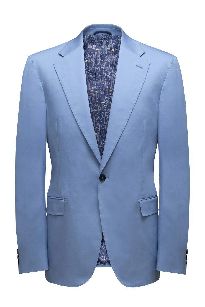 Costume sur mesure bleu ciel, décontracté et contemporain.